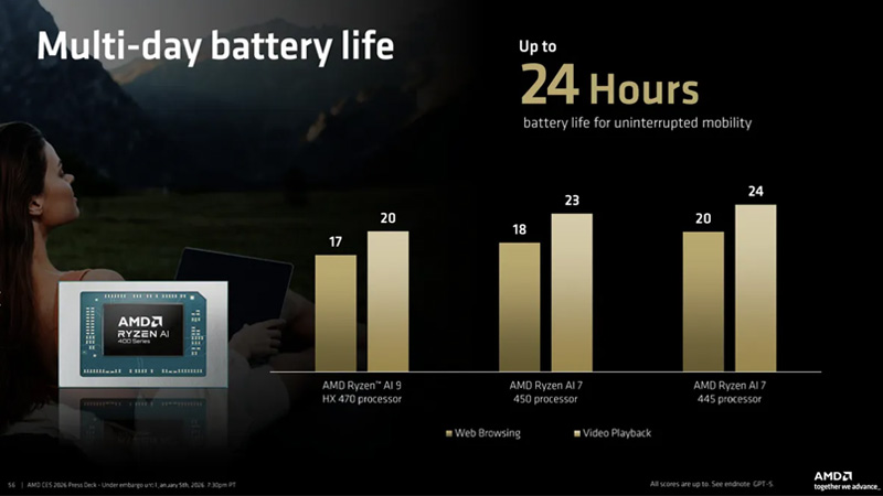 Theo công bố của AMD, các mẫu laptop dùng Ryzen AI 400 Series – trong đó bao gồm Ryzen AI 7 445 – có thể đạt thời lượng pin lên tới 24 giờ trong những kịch bản sử dụng tối ưu, nhấn mạnh định hướng của nền tảng này không chỉ xoay quanh AI, mà còn tập trung mạnh vào hiệu quả năng lượng và pin lâu cho laptop mỏng nhẹ.
