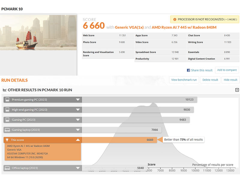 Trong bài đo PCMark 10 - công cụ mô phỏng các kịch bản sử dụng thực tế như duyệt web, xử lý văn bản, bảng tính và họp trực tuyến - cấu hình gồm Ryzen AI 7 445, RAM DDR5 16GB và SSD NVMe Gen 4 512GB trên hai mẫu máy đạt điểm số cao hơn 73% các kết quả được ghi nhận.